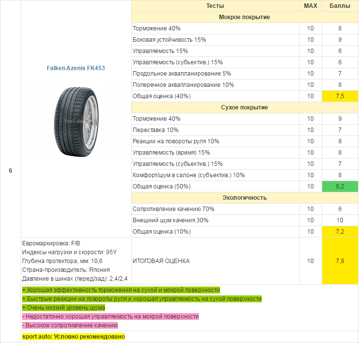 Специалисты Sport Auto поставили высокую оценку шинам Continental SportContact 6, которые отличились четким реагированием на рулевые повороты и предсказуемостью при предельном сцеплении. Однако, при тестировании на эффективность тормозных характеристик на влажном и сухом асфальте эти шины отстают от Pirelli за счет восприимчивости к температурным режимам. Но при тестировании на стойкость к аквапланированию им удалось реабилитироваться.