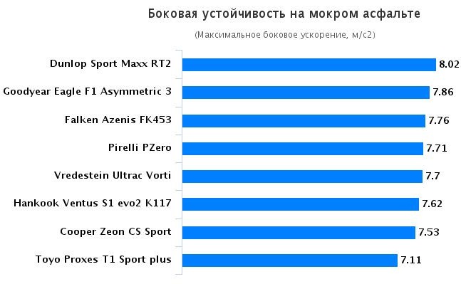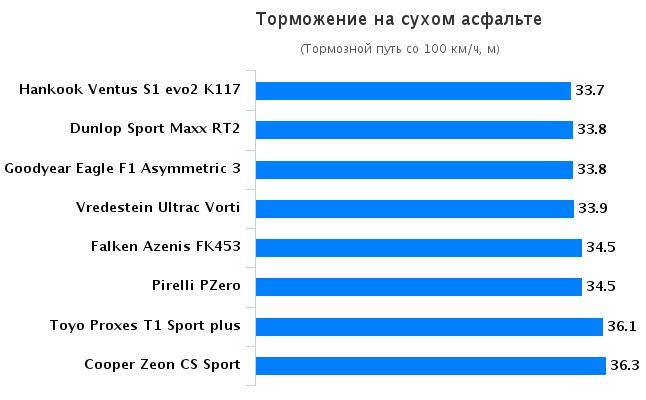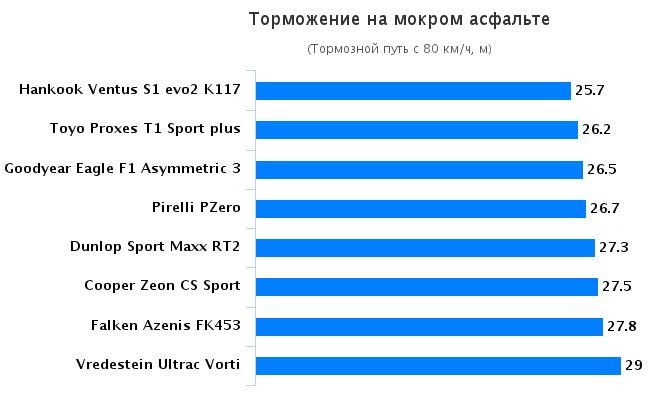 Что касается тормозных свойств на влажном покрытии, место победителя заняли Hankook. Второе место досталось шинам Toyo. Также, достойные характеристики показали Pirelli и Goodyear, у которых тормозное расстояние не превысило 27 метров. Характеристики остальных шин тоже были не больше 28 метров, кроме Vredestein, которым потребовалось 29 метров для полной остановки.