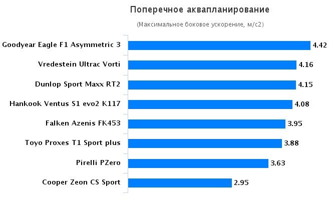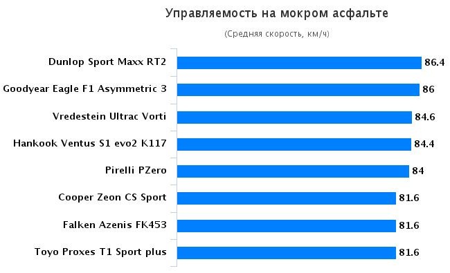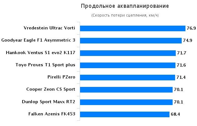 Кроме параметров торможения, на влажном покрытии проверялась управляемость и стойкость к аквапланированию. В первом случае практически все автопокрышки продемонстрировали отличные показатели, кроме Cooper и Pirelli. Самые высокие показатели управляемости при движении на мокрой поверхности дали Goodyear и Dunlop, которые показали отличную устойчивость, четкое реагирование на рулевые повороты и хорошую маневренность.