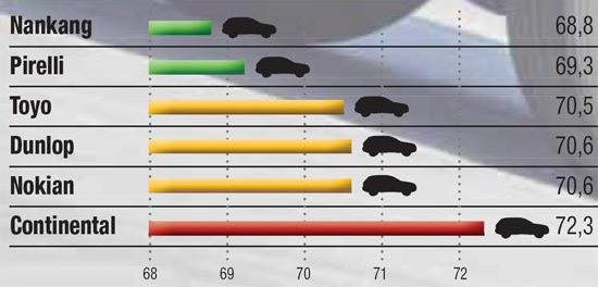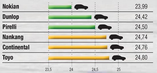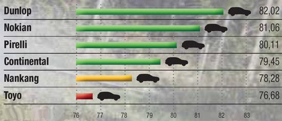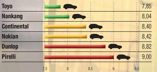 - Как и на сухом треке, первыми в тесте на эффективность торможения на мокром асфальте вновь стали шины Nokian. Впрочем, шины Pirelli не сильно отстали от лидеров - они остановили автомобиль всего на сантиметр дальше. Далее следуют Continental и Dunlop с почти одинаковыми показателями. Тормозную дистанцию шин Toyo нельзя назвать хорошей, эти покрышки получили удовлетворительную оценку, а у Nankang опять проблемы, из-за которых тайваньские покрышки окончательно испортили себе финальный рейтинг.