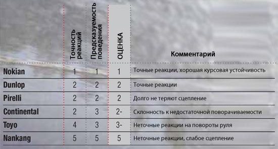 - На мокром треке дела у Nankang становятся еще хуже, они становятся еще более непредсказуемы в поведении, быстро теряют сцепление с дорожным полотном и постоянно норовят уйти в занос. Toyo наоборот на орошаемом треке смогли себя немного реабилитировать, хотя их реакция на повороты руля и несколько замедлена, но зато надежна. Лучшими на мокрой трассе стала все та же группа из Nokian, Dunlop, Pirelli и Continental. Особо порадовали тест-пилотов шины Nokian, позволяющие автомобилю проходить повороты точно "как по рельсам" и сохраняющие сцепление с дорогой даже при сильном разгоне машины.