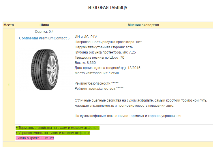 После проведенных испытаний лидирующие позиции заняли покрышки Continental ContiPremiumContact 5, которые показали безукоризненные тормозные возможности при передвижении как по сухому, так и по мокрому дорожному покрытию. Благодаря своим сбалансированным свойствам данная модель считается идеальным выбором для комфортной и максимально безопасной езды.