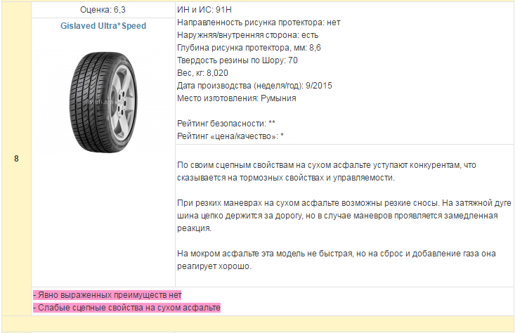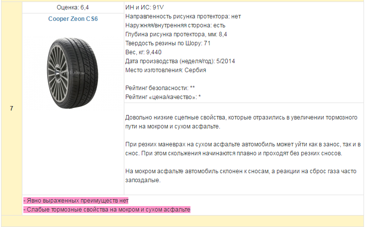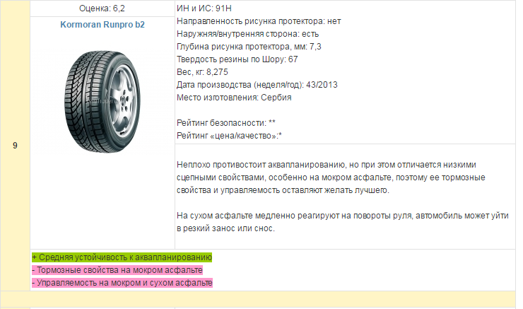 Седьмую и восьмую позицию получили покрышки Cooper Zeon CS6, показавшие низкие тормозные возможности и на сухой и мокрой поверхности, и Gislaved Ultra*Speed, отличившиеся длительным торможением на сухом асфальте. В число аутсайдеров были зачислены шины Kormoran RunPro B2 со слабыми тормозными характеристиками и отсутствием необходимой управляемости на сухих и влажных дорогах.