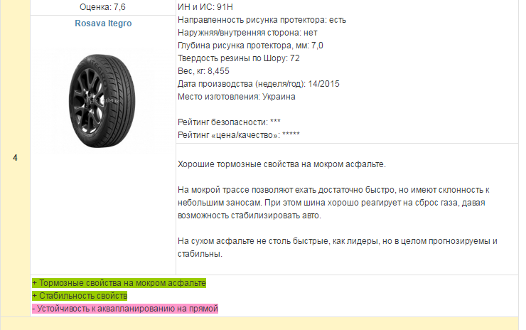 Четвертое место было присвоено производителю из Украины ЗАО «Росава». Согласно полученным результатам, летние покрышки Rosava Itegro соответствуют высоким мировым стандартам, также как Hankook и Michelin. К числу преимуществ данной резины относятся безупречные тормозные характеристики при движении по влажному покрытию и предсказуемое реагирование автотранспортного средства, оборудованного данными покрышками. Если сравнивать с подобными изделиями конкурирующих фирм, то они относятся к бюджетным моделям, Itegro также обеспечивают отличную управляемость. Однако, у этих автошин есть одно слабое место – недостаточная стойкость к аквапланированию при движении по прямой.