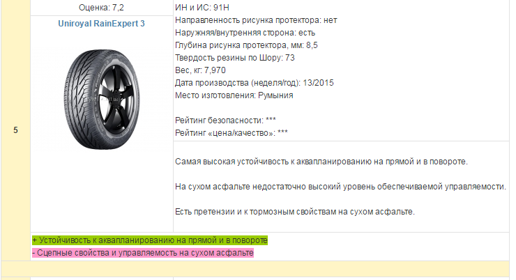 На пятой устойчивой позиции оказались автопокрышки Uniroyal RainExpert 3, объявленные производителем в качестве дождевых. Согласно результатам испытаний шины полностью соответствуют своему целевому назначению: данная отличилась предельной стойкостью к аквапланированию, что ее значительно выделило на фоне остальных. Наличие массивных каналов и специальных углублений положительным образом отразилось на показателях безопасности при передвижении в дождливый период, благодаря максимальному поглощению жидкости.
