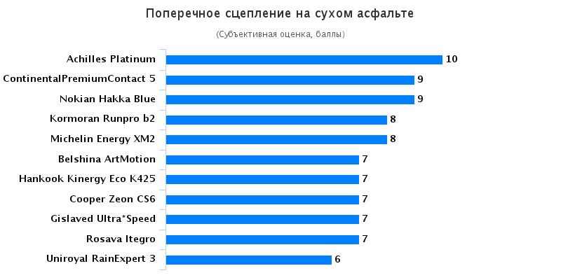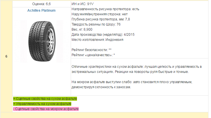 К шестому месту уверенно пришли Achilles Platinum, которые продемонстрировали значительное различие свойств при движении по влажному и сухому асфальту. На сухом покрытии данный вид шин прославился отличными показателями управляемости и хорошими тормозными качествами, а на влажном – подобные покрышки ведут себя непредсказуемо.