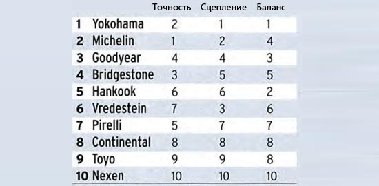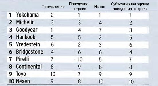 Первое место заняли шины Yokohama Advan Sport V105, показавшие блестящие результаты по всем критериям, несмотря на то, что они не самые дорогие. За ними следуют шины Michelin, являющиеся надежным изделием, сохраняя удовольствие, эффективность и полную гармонию качеств. Третью ступень подиума победителей заняли шины Goodyear, обеспечивающие великолепные ощущения и обладающие лучшим качеством торможения на сухом асфальте. Hankook завершают испытания на четвертом месте благодаря своему адекватному, легкому и без ярко выраженной спортивности поведению, что делает из них хорошее компромиссное решение. Результат шин Vredestein, занявших пятую строчку рейтинга, оказался для экспертов приятным сюрпризом, учитывая их более доступную стоимость. Очень быстрые на трассе, они побеждают некоторые марки премиум-класса несмотря на более низкую цену.