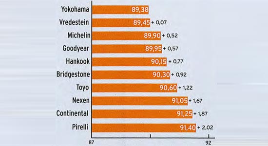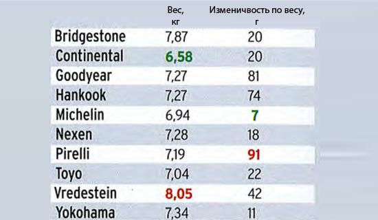 Разница в цене может быть очень существенной, и, что любопытно, тоже самое происходит с разницей в весе! Мы позаботились о том, чтобы каждая шина была взвешена, и опять же, результаты могут Вас удивить. Между самой легкой шиной (Continental) и наиболее тяжелой (Vredestein), мы отметили разницу в 2,15 килограмма на одну шину. Такая значительная разница в весе, без сомнений, влияет на динамичность поведения автомобиля. Другой интересный, изученный нами критерий, это изменчивость: отмечено, что шины одной и той же марки имеют более или менее одинаковый вес в зависимости от марок. У шин Michelin, выступающих эталоном в данной области, изменчивость веса на четырех шинах в среднем, равна всего 10 граммам. У Pirelli она достигает 132 грамма. Несомненно, это связано с разницей совершенствования средств производства в одной и другой компании...