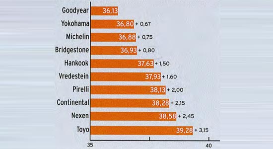 В итоге, между наилучшим результатом, который показали шины Goodyear и наихудшим, что продемонстрировали Toyo, дистанция достигает 3,15 метра, а это составляет длину небольшого городского автомобиля.