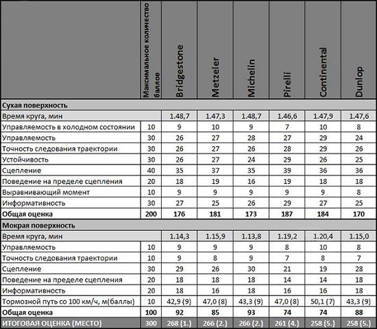 С Dunlop были связаны большие ожидания после предварительных тестов, но, к сожалению, они их не оправдали, поскольку им требуется относительно много времени для нагрева, и они медленнее других спортивных шин. При сильных нагрузках им не хватает устойчивости. На мокром треке у Dunlop хорошее время, и они сравнимы с Michelin в плане эффективности торможения, но не в плане точности прохождения поворотов. Из-за негармоничности поведения шины не попали на первые строчки рейтинга. |