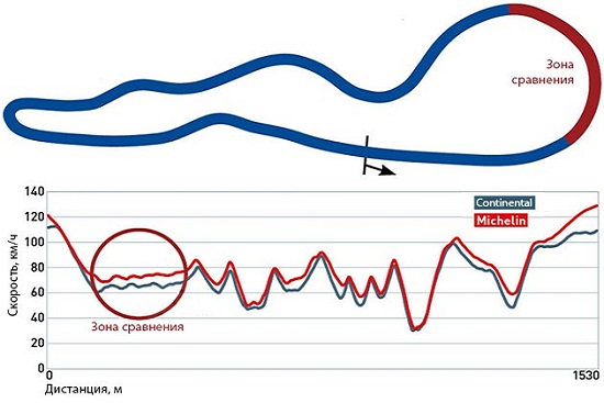 На этой 1530-метровой трассе самыми быстрыми оказались мотошины Michelin, а самыми медленными – Continental. К тому же в длинном левом повороте Michelin оставляли Continental далеко позади – первые шины проходили его при 73 км/ч, а вторые только при 65,5 км/ч. В этом же повороте максимальный угол наклона Michelin составил 26,3 градуса, а у Continental лишь 22,2 градуса. Естественно, лучшее время показали шины Michelin, обогнав Continental на 6,6 секунды с круга.