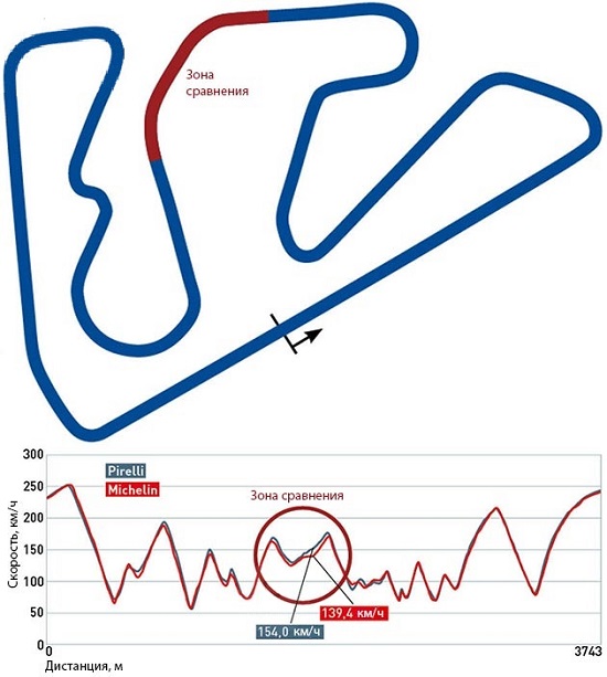 Длина трека составляет 3 473 метра, и хотя асфальт тут очень «липкий», перепады высоты делают его идеальным для шинных тестов. Здесь полугоночные мотошины Pirelli смогли разогнаться до 154 км/ч, а не очень устойчивые Michelin только до 139,4 км.