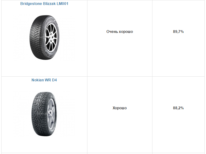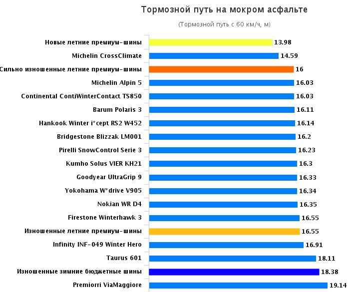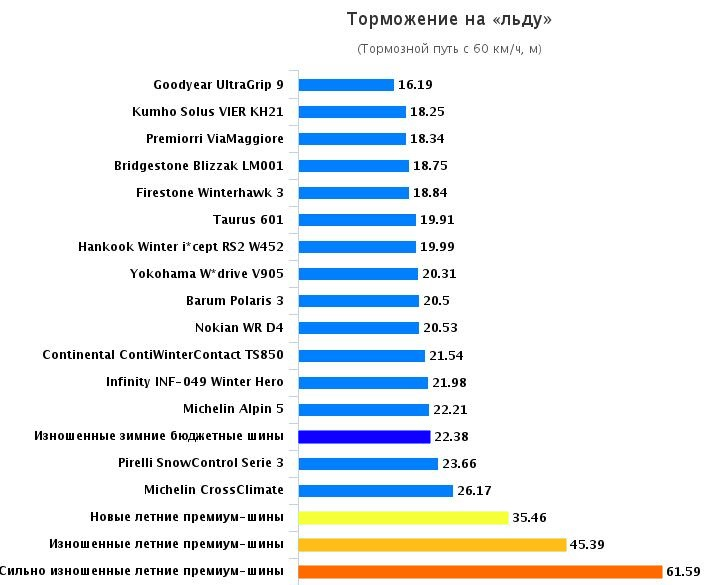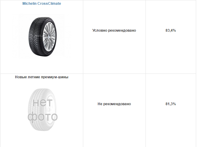 Лидером при испытании на влажном и сухом покрытии стали Michelin CrossClimate. Однако, на поверхности, идентичной ледяному покрытию, данные шины демонстрируют характеристики, напоминающие летние покрышки. Тормозная дистанция Michelin оказалась на 32,5% больше, по сравнению с зимним вариантом Goodyear, а у популярных летних покрышек эти показатели были ниже на 51% чем у победителя.