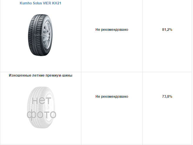 Вместе с зимними автошинами от известных производителей в список участников вошли три вида летних покрышек различного года выпуска и разным уровнем износа. Согласно окончательным результатам, новые покрышки и покрышки, возраст которых составляет 3-5 лет, также различаются по степени износа и имеют разные показатели. Кроме того, в тестировании были задействованы «всесезонки» Michelin CrossClimate и Kumho Solus Vier KH21, пользующиеся популярностью у большинства автолюбителей, и изношенные зимние автопокрышки.