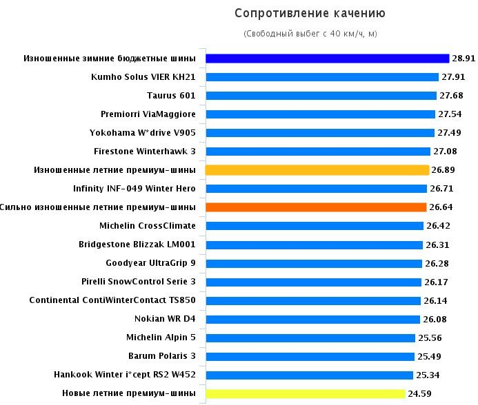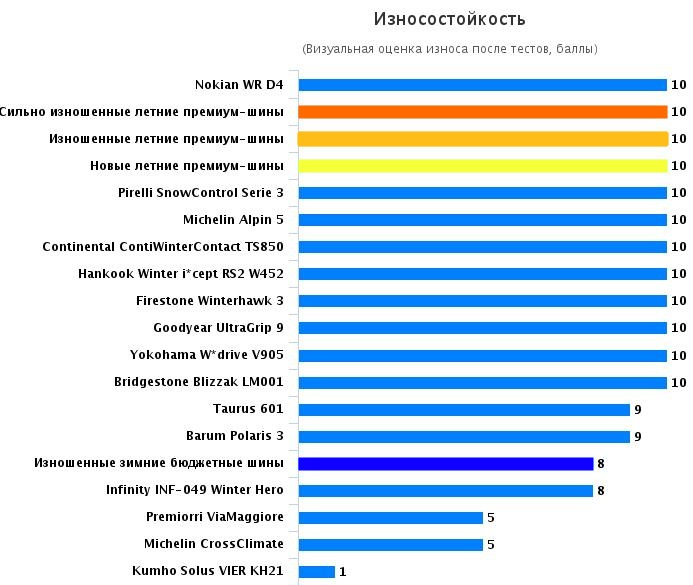 Таким образом удалось выявить лидеров: на влажном и сухом дорожном покрытии победили Michelin CrossClimate и новые летние модели, а при испытаниях на обледенелой поверхности – Premiorri и Goodyear. Самый низкий уровень шума продемонстрировали изношенные летние покрышки. При тестировании противодействия качению в лидерах оказались изношенные шины. Также, специалисты Autonavigator проверяли устойчивость к износу. Самые высокие показатели износа были обнаружены у Taurus, Infinity, Michelin, Barum, Kumho и у изношенных зимних покрышек.