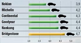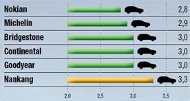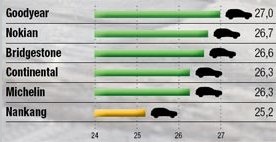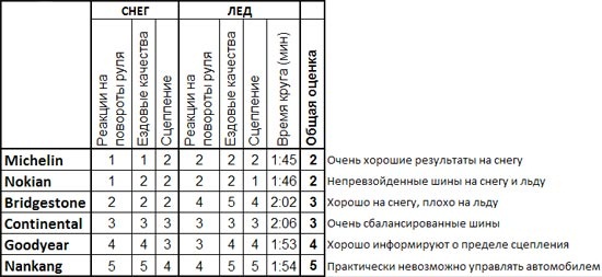 На этот раз из группы претендентов выделяются две шины – Nokian и Michelin – которые не позволили себе никаких слабостей на снегу и льду. Остальные кандидаты также показали себя более чем достойно, и претензии возникают только к тайваньским Nankang, которые «в зимних условиях ведут себя совершенно непредсказуемо и теряют сцепление без всякого предупреждения». Впрочем, справедливости ради стоит отметить, что несколько раз тест-пилоты вылетали с обледенелой трассы и на авторезине топовых брендов.