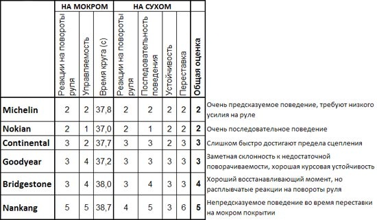 Победителей выбирали на основе результатов всех описанных тестов, а также с учетом субъективных оценок управляемости всех шин. Два тест-пилота независимо друг от друга совершили на каждом комплекте резины по несколько заездов по льду, снегу, сухому и мокрому асфальту, после чего определили средний результат для каждого участника теста.