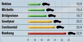 Что касается тягового усилия на снегу, то в этой дисциплине все покрышки показали практически одинаковые результаты, лишь бюджетные Nankang тайваньского производства немного отстали от своих премиальных конкурентов. В тесте на эффективность торможения только три автошины смогли уложиться в 20 метров, быстрее всех остановилисьNokian, а дольше всех остальных покрышек тормозили шины Nankang.