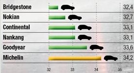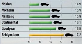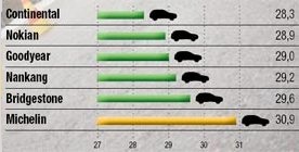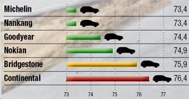 В тесте на торможение на сухом и мокром асфальте особые требования предъявляются не только к резине, но и к тест-пилоту, который должен 10 раз подряд остановиться со скорости 100 км/ч, причем сделать это максимально одинаково и каждый раз терпеть нагрузки. Michelin, отлично показавшие себя во всех дисциплинах в зимних условиях, на асфальте неожиданно оказались позади всех. При этом Nokian и другие сильные покрышки все же смогли удержаться на асфальте в группе лидеров.