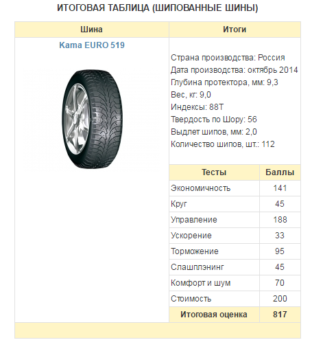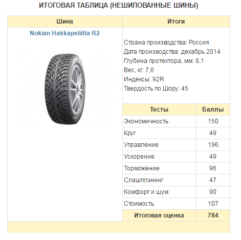 Победителями тестов были объявлены фрикционные покрышки Nokian Hakkapeliitta R2. Шипованные шины Kama Euro 519 были признаны лидерами, продемонстрировавшими идеальное сочетание приемлемой стоимости и безукоризненных ездовых хаактеристик.
