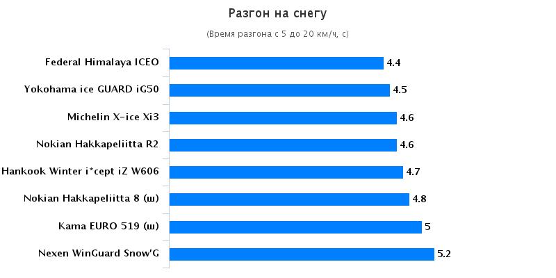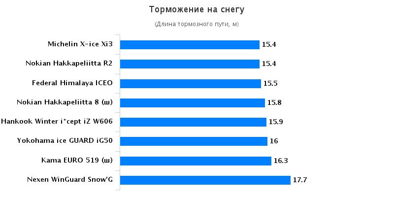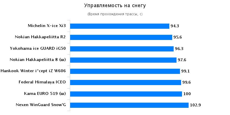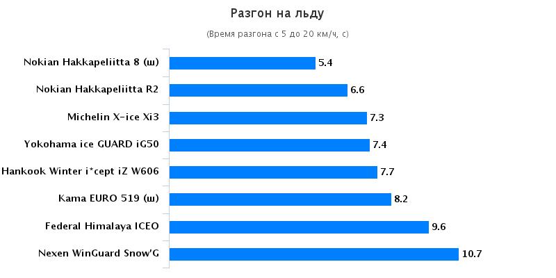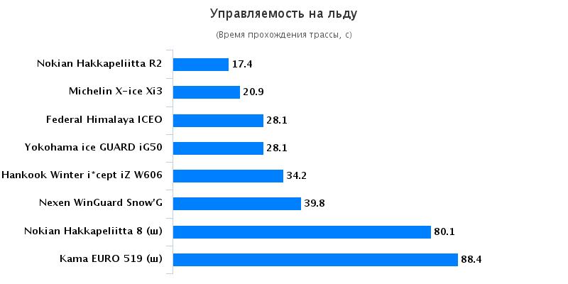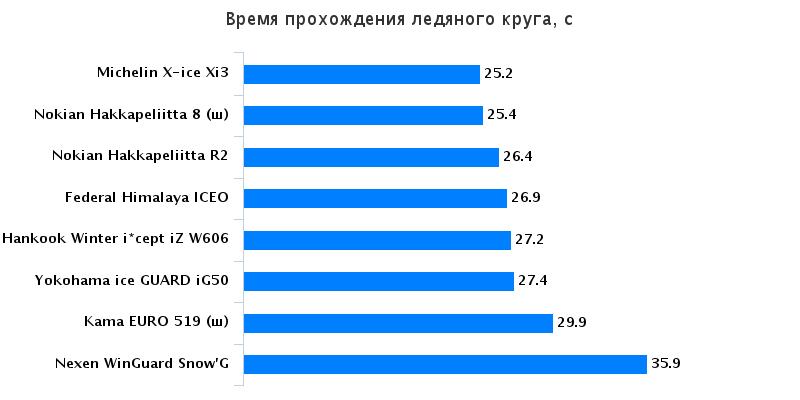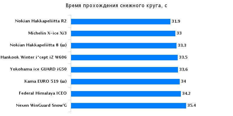 С целью выявления сцепных свойств при движении на заснеженном и обледенелом покрытиях было предложено выполнить заезды на ледяном и снежном круге, протяженность которых составила 300-350 м. Основной задачей данного тестирования стало прохождение дистанции за кратчайший промежуток времени. Покрышки, которые продемонстрировали наиболее высокие результаты при преодолении дистанции, также прославились наличием лучшего бокового зацепа. Гарантией объективности имеющейся информации является применение референсных покрышек. На лидирующие позиции вышли покрышки Hankook, Nokian, Michelin, Yokohama, а самые низкие показатели на ледяном покрытии были обнаружены у резины Nexen.