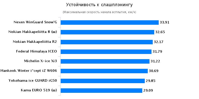 Поскольку наиболее трудным тестом для шин является снежная шуга, то исследования на устойчивость заняли особое место во всей процедуре. Во время тестирования специалисты нашли предельную скорость, за счет которой автомобиль перестает реагировать на управление, а передние колеса «взлетают» над дорожным покрытием.