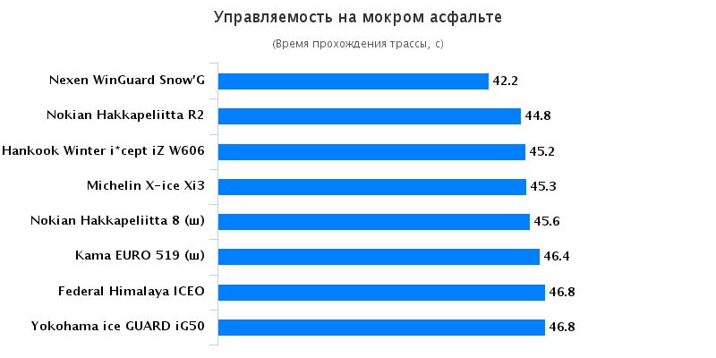 Текст на управляемость был произведен на трех видах покрытия – на влажном асфальте, заснеженной поверхности и на льду. Нешипованные шины Nokian смогли достаточно быстро преодолеть круг, автотранспортное средство моментально набирало обороты и практически не скользило. Nexen показали хорошие свойства при движении по снегу, а на ледяной поверхности они двигались значительно хуже летнего варианта покрышек. Однако, данная модель смогла реабилитироваться на влажном асфальте, что наталкивает на мысль о том, что данная резина не адаптирована для езды в холодное время года. Шипованные шины выступают гарантом максимально безопасного передвижения.