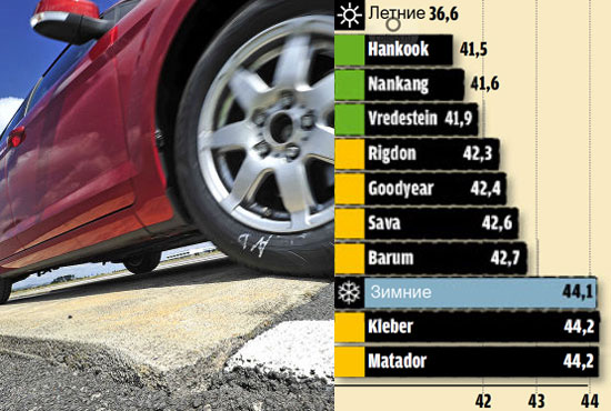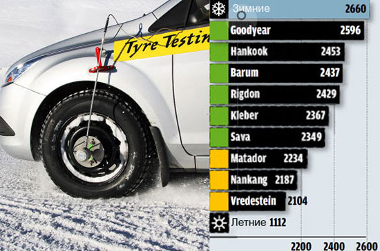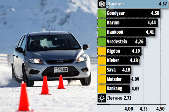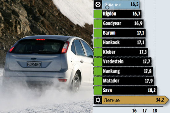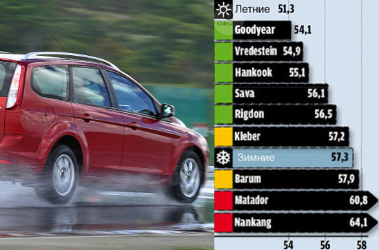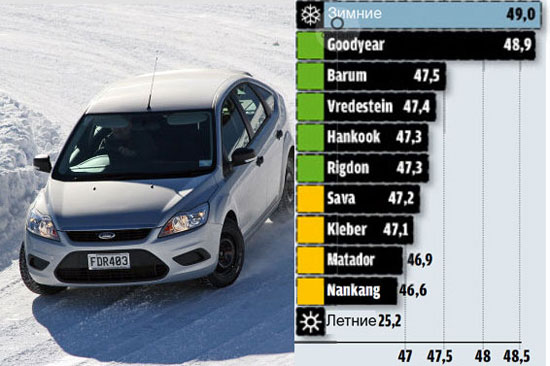 Как и следовало ожидать, здесь лучше всего показали себя зимние шины, а лучшими из всесзонных стали Goodyear. Matador, Nankang и Vredestein обеспечивают в таких условиях лишь удовлетворительное тяговое усилие.