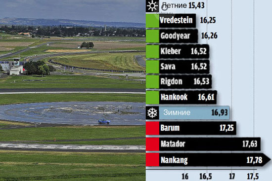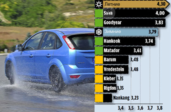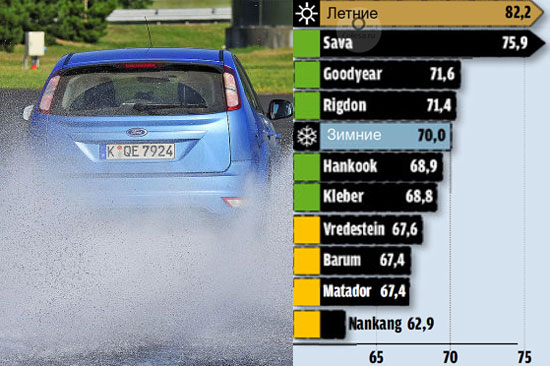 В тестах на мокрой поверхности ориентиром стали уже летние шины, обладающие лучшей управляемостью. В тесте на круговом треке за ними с определенным интервалом следуют Vredestein и Goodyear, тогда как Barum, Matador и Nankang заметно не хватает сцепления.