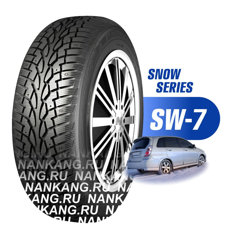 Nankang Snow Winter SW7 – шипуемая зимняя резина с направленным рисунком протектора для легковых автомобилей, рекомендуется для климата средней полосы. Эти покрышки отлично ведут себя на снегу и льду, могут использоваться в межсезонье по грязи и слякоти. Шипы повышают качество сцепления с обледенелой дорогой. Специально разработанный дизайн этих шин с центральной дорожкой повышает сцепление с дорогой и дает возможность уверенно передвигаться зимой. В протекторе большое количество широких и зигзагообразных ламелей, которые гарантируют хорошее сцепление со снегом и льдом. Щелевидные дренажные канавки имеют зигзагообразную форму, которая улучшает тормозные характеристики, делая движение более комфортным и безопасным. Объемный дизайн ламелей покрышки повышает устойчивость автомобиля при маневрах и поворотах. При изготовлении шин Snow Winter SW-7 используются специальные очищенные масла, которые соответствуют требованиям стран Евросоюза. Индексы скорости – Т (до 190 км/час), Н (до 210 км/час).